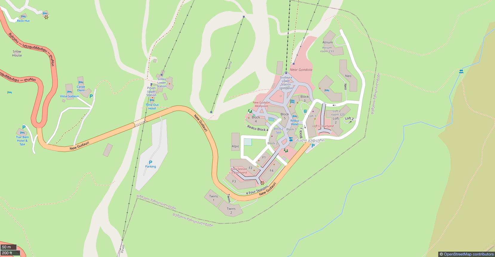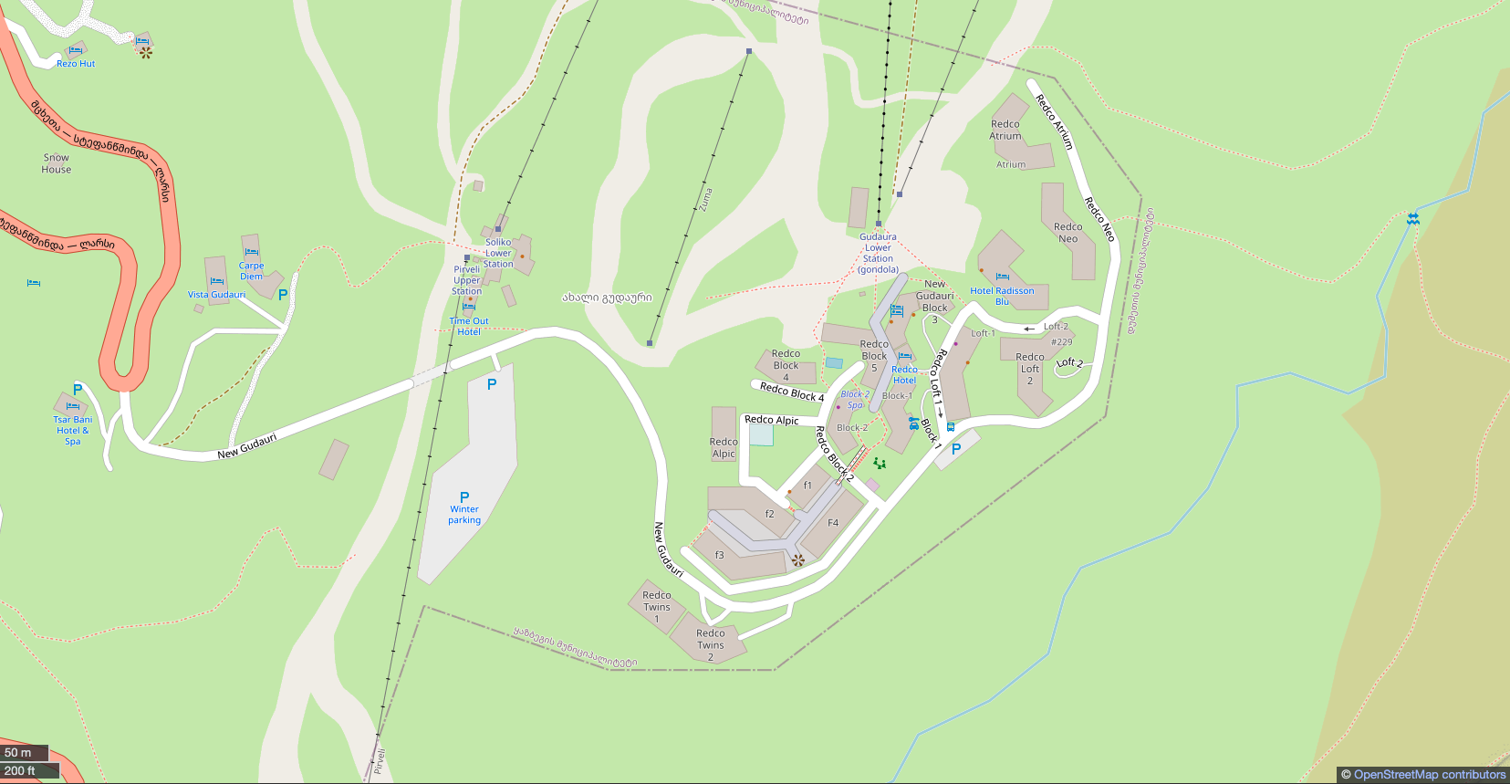 We have processed the Geoinformation data of the New Gudauri area based on personal expertise and satellite imagery. As a result, we updated the map, adding pedestrian streets, stairways, squares, and commercial courtyards located near various blocks.